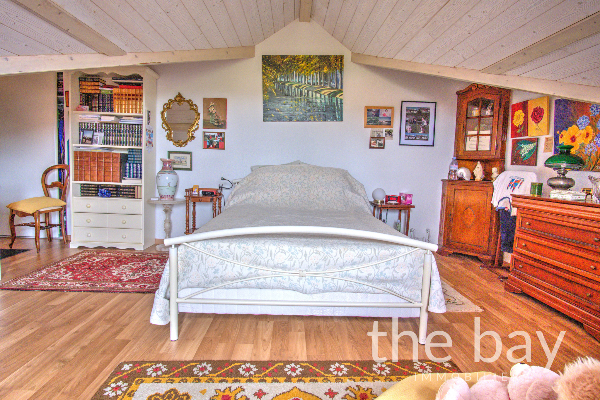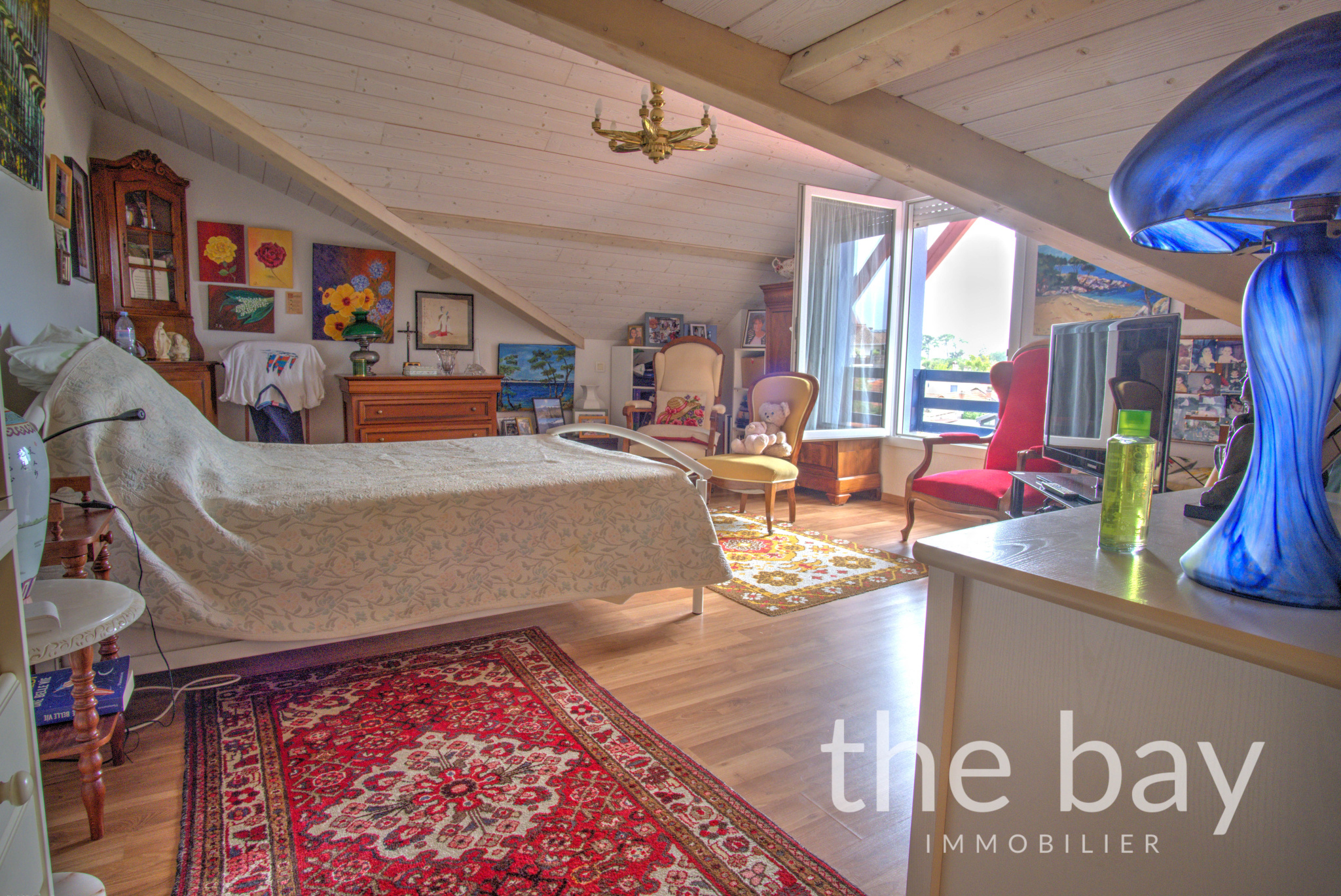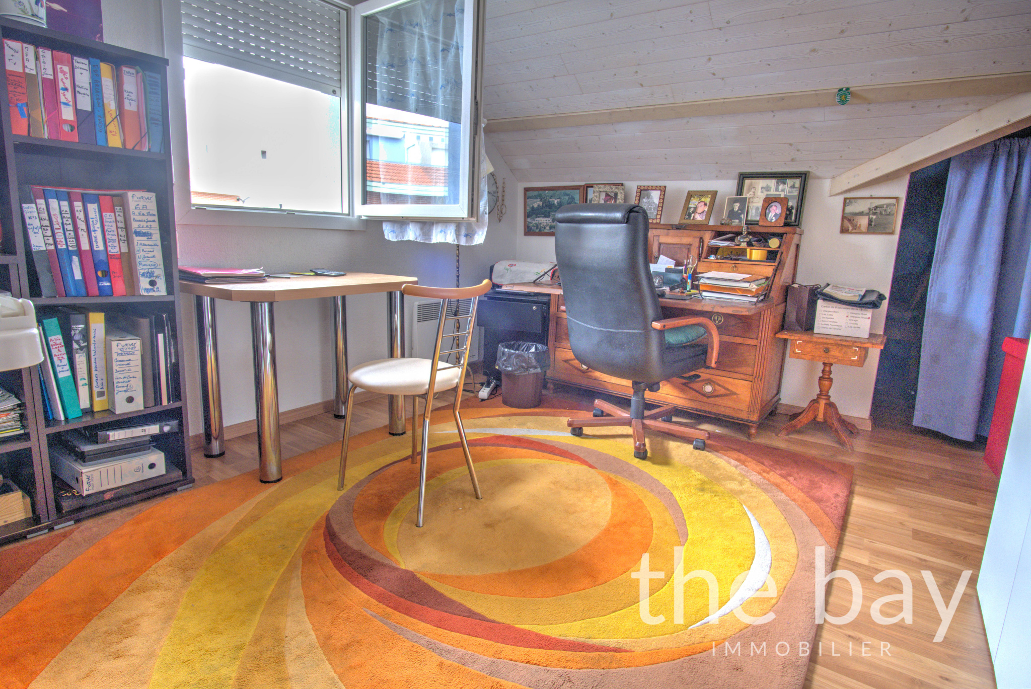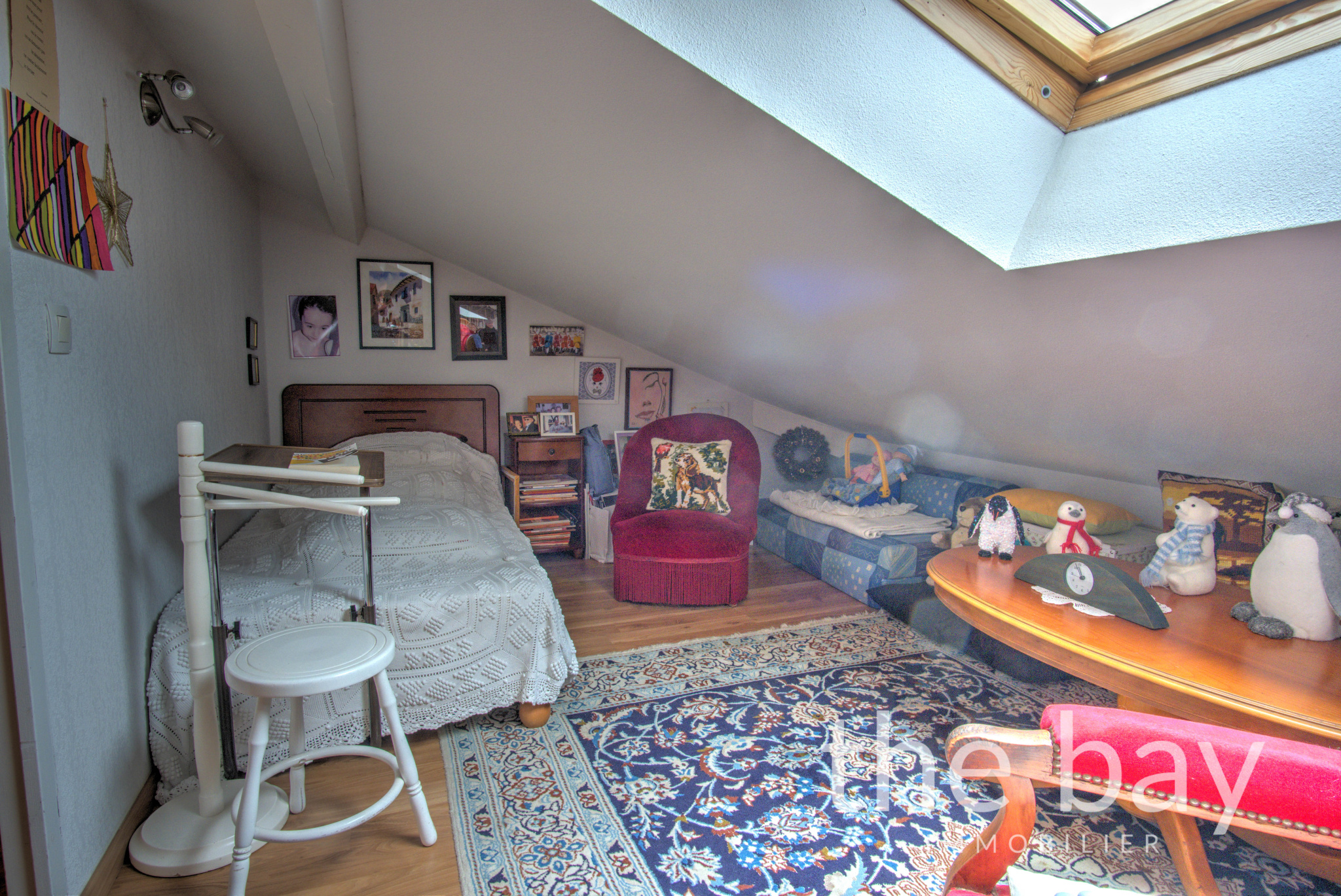 À l'étage, vous trouverez deux chambres dont une spacieuse de plus de 17 m2 (25 m2 au sol), un bureau, une salle de bains avec douche et WC, ainsi qu'un espace de rangement mansardé de plus de 10 m2.