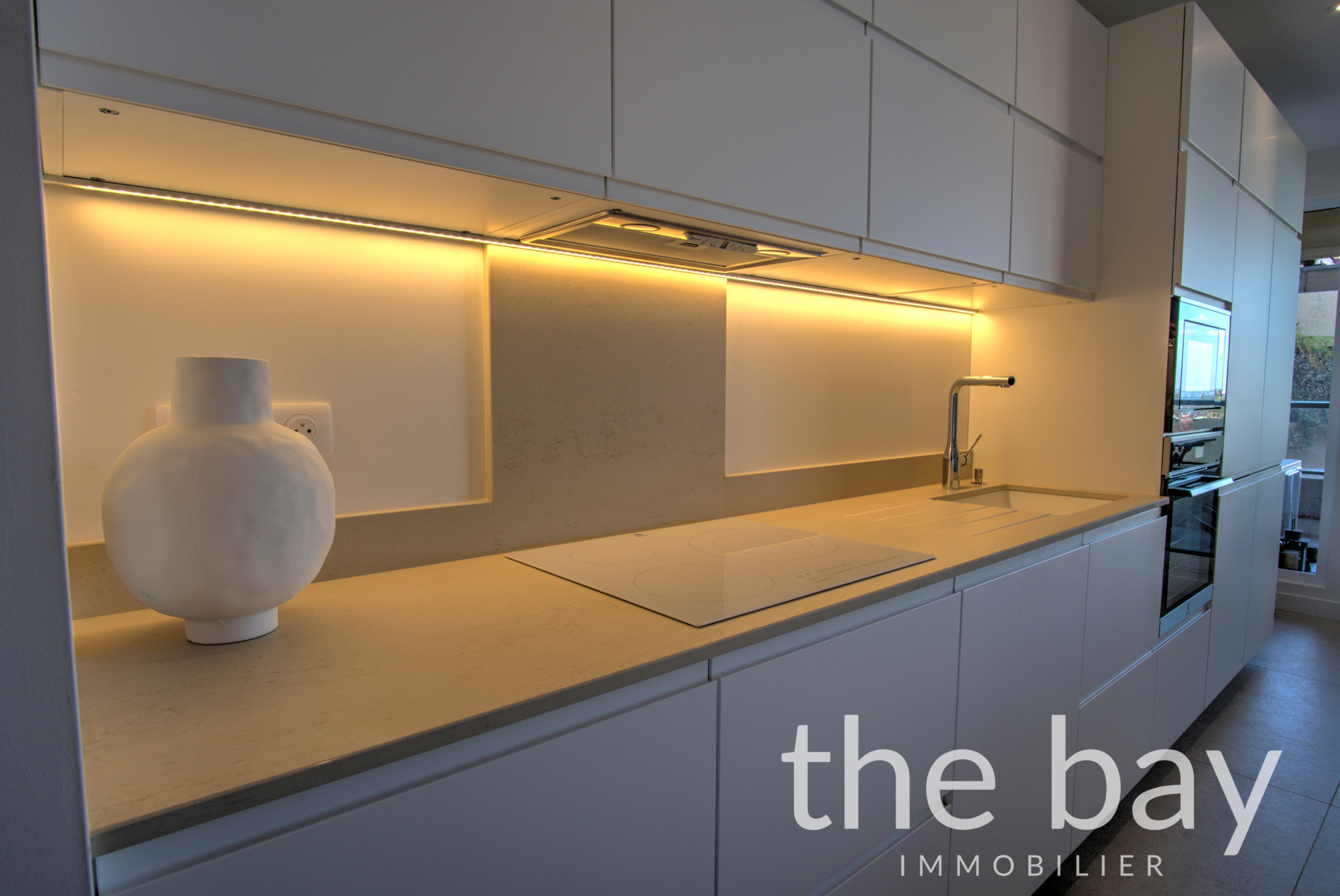 Cuisine entièrement équipée, moderne et fonctionnelle, ouverte sur le séjour.