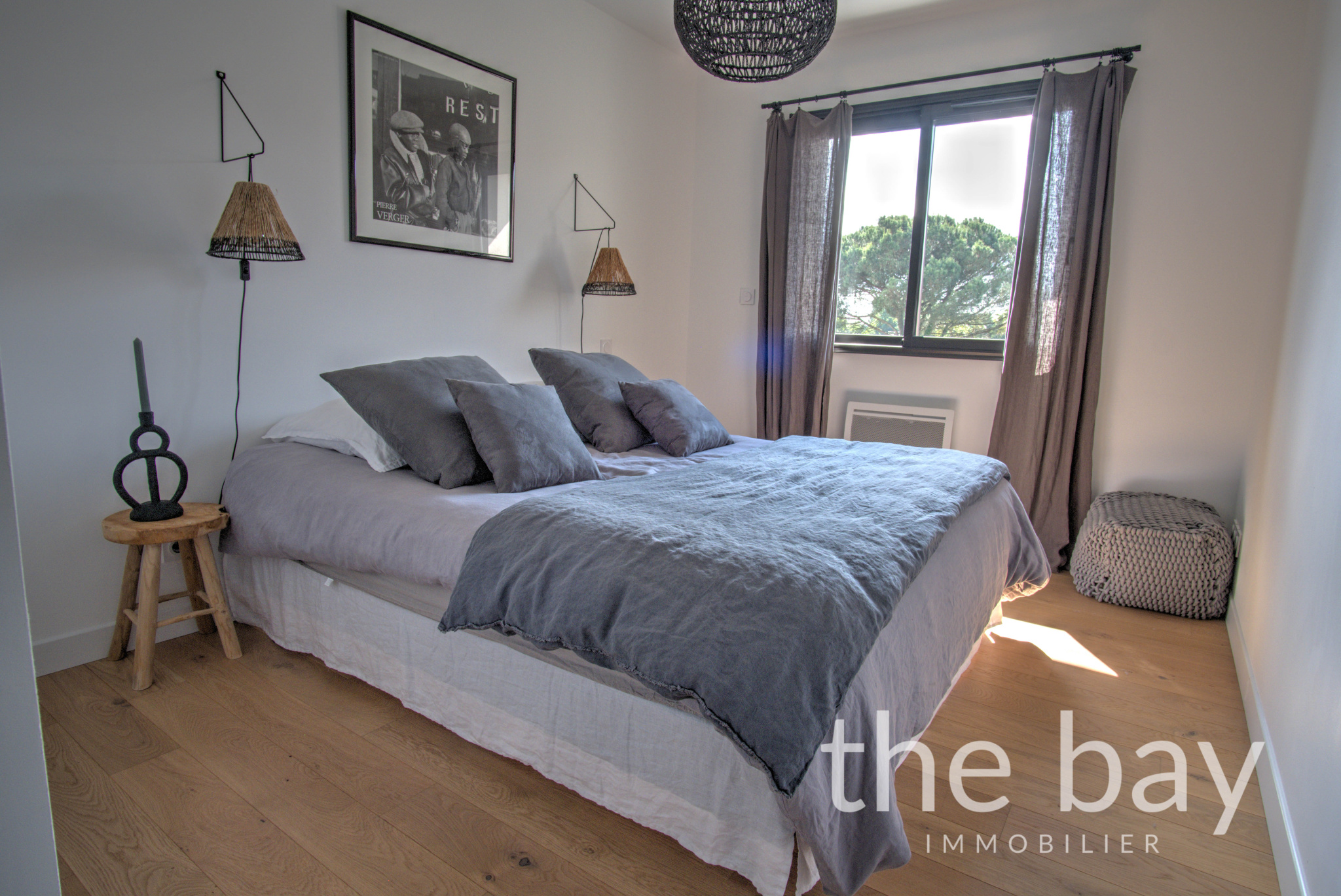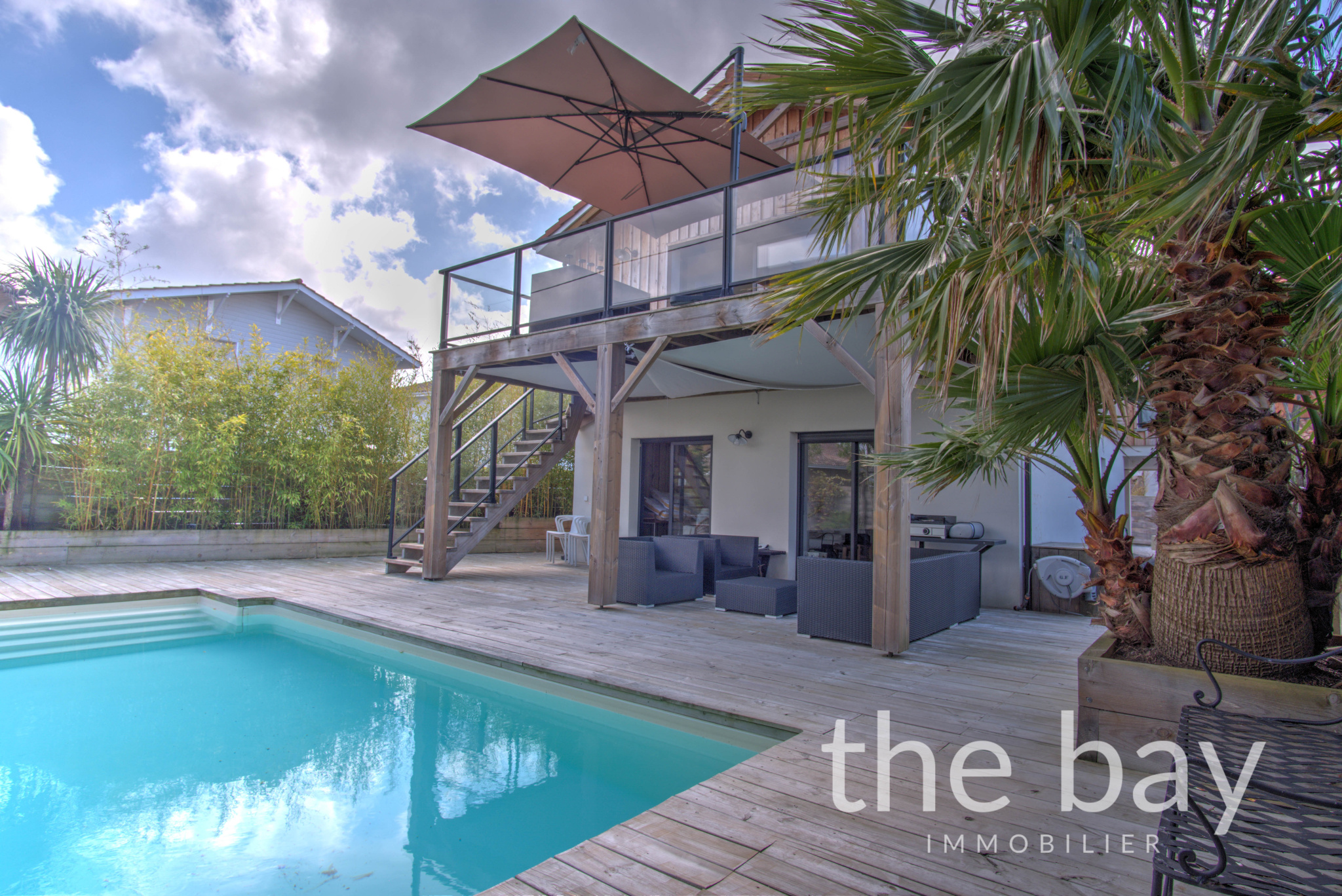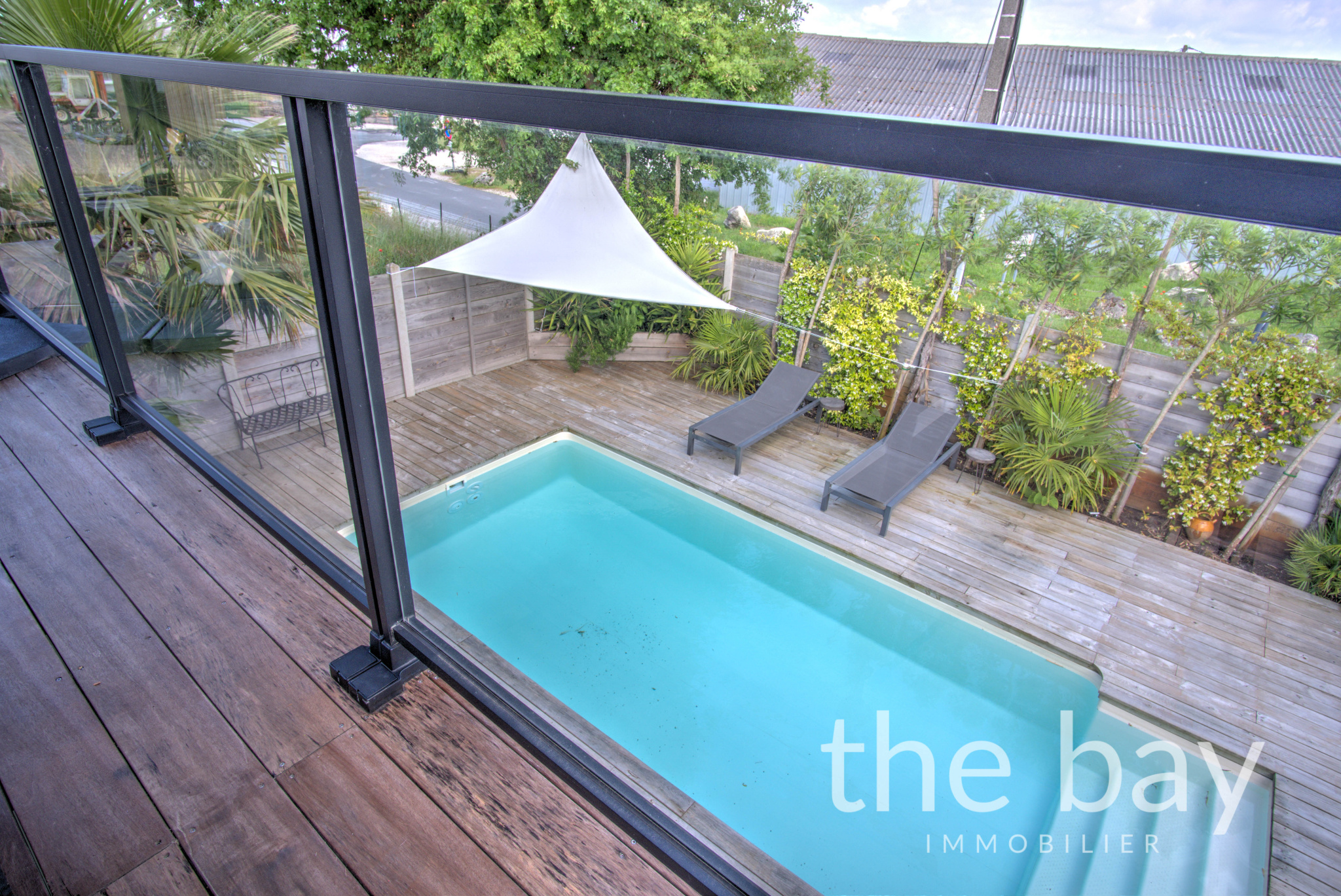 À l'étage, une vaste pièce de vie baignée de lumière s'accompagne de deux chambres, chacune avec sa salle d'eau, ainsi que d'une suite parentale disposant de sa propre salle d'eau, de WC et d'un dressing. Le séjour s'ouvre sur une grande terrasse en bois dominant le jardin. Cet espace extérieur invite à la contemplation, prolongeant le séjour vers un environnement apaisant, avec en contrebas une élégante piscine chauffée.