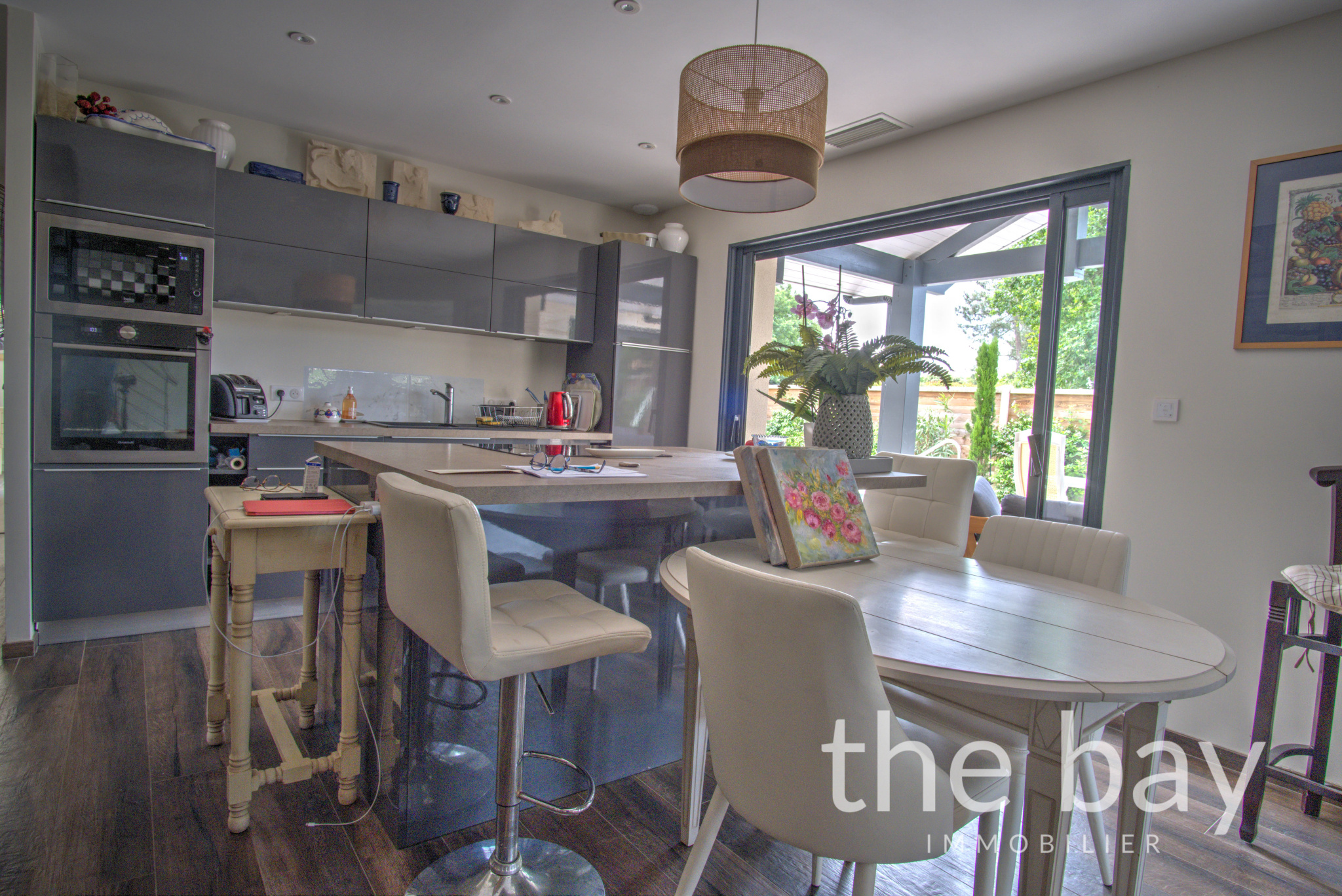 Dès l'entrée, les volumes généreux et la lumière omniprésente donnent le ton. La pièce de vie d'environ 55 m2, avec ses belles hauteurs sous plafond et sa cuisine américaine équipée prolongée par un cellier discret, s'ouvre largement sur l'extérieur.