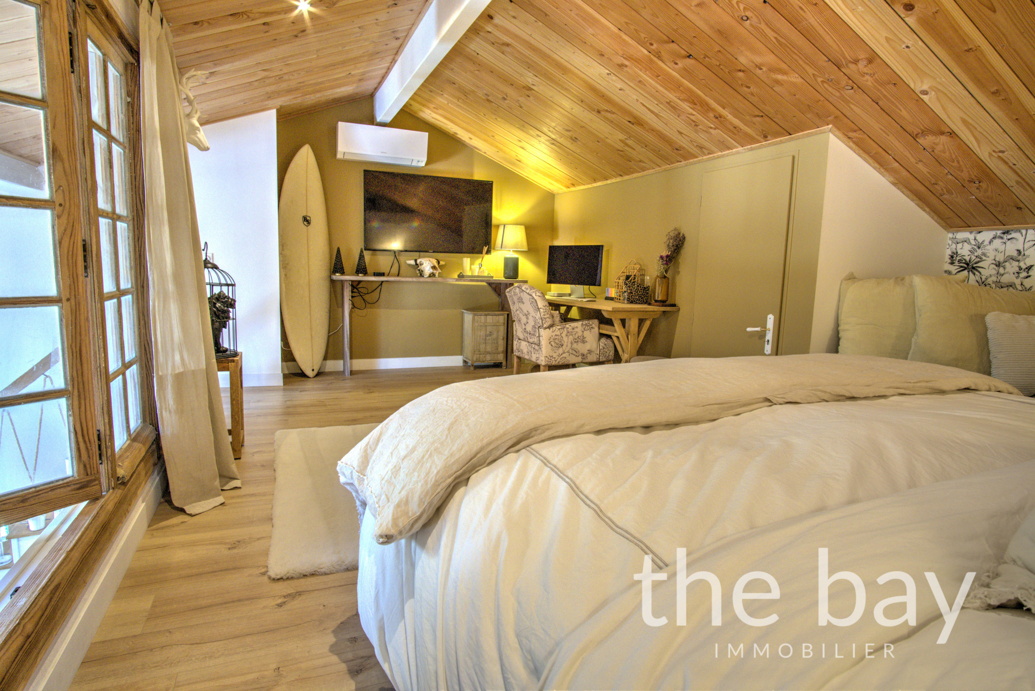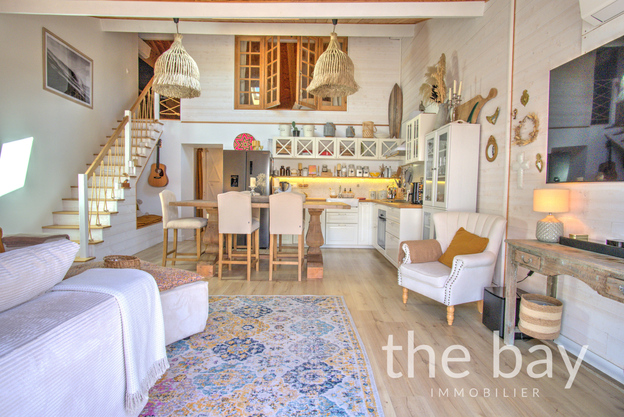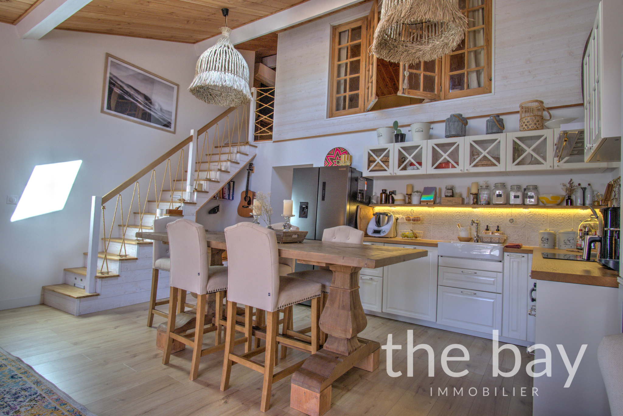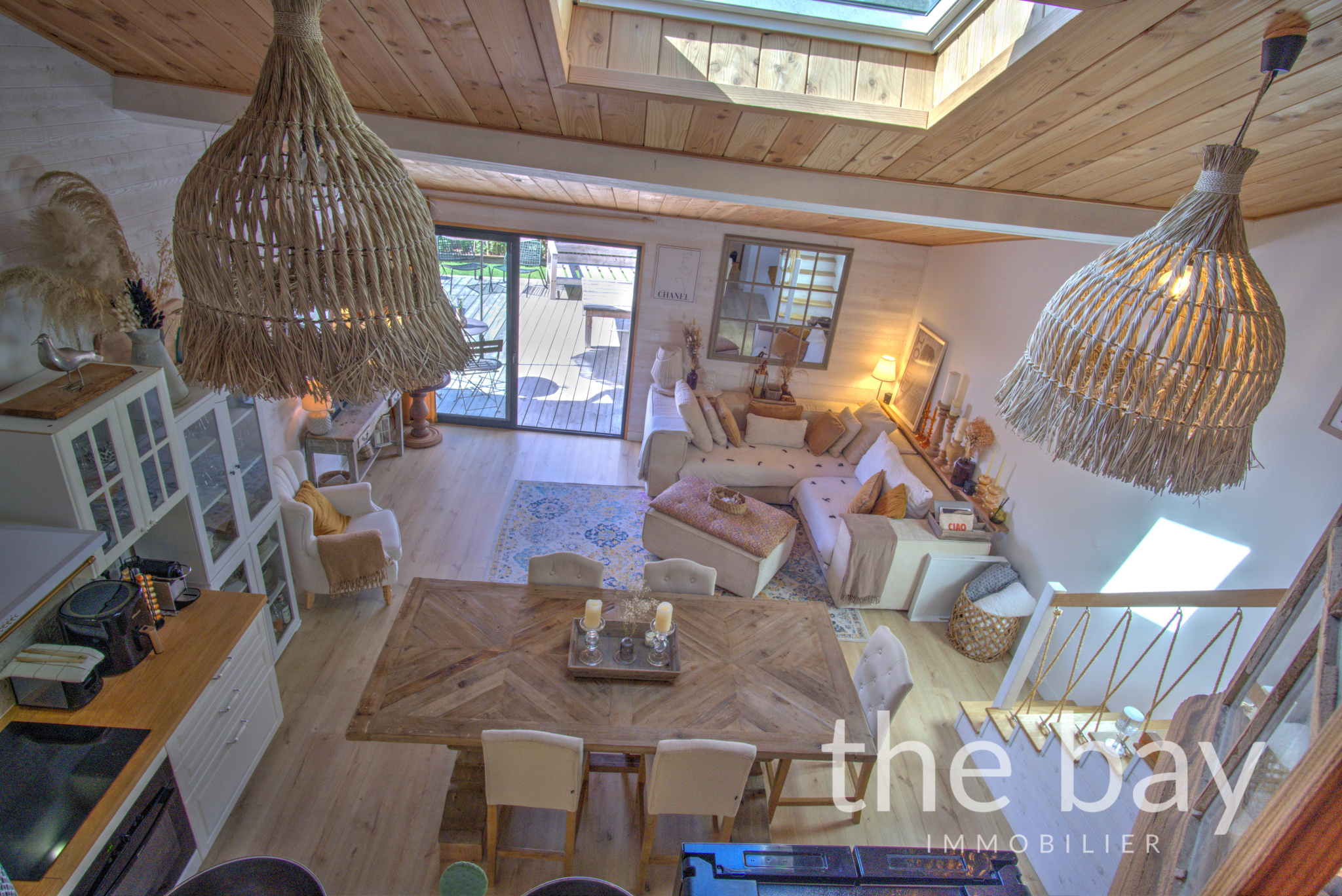 Au rez-de-chaussée : une entrée, une magnifique pièce de vie au plafond cathédrale avec cuisine ouverte, un bureau, une chambre, une salle d'eau, un WC et un cellier.À l'étage : une vaste chambre parentale de plus de 22 m2, ouverte sur le séjour, offrant un espace intime et lumineux.À l'extérieur : une superbe terrasse ensoleillée de plus de 60 m2, à l'abri des regards et parfaitement aménagée, ainsi qu'un abri vélo.
