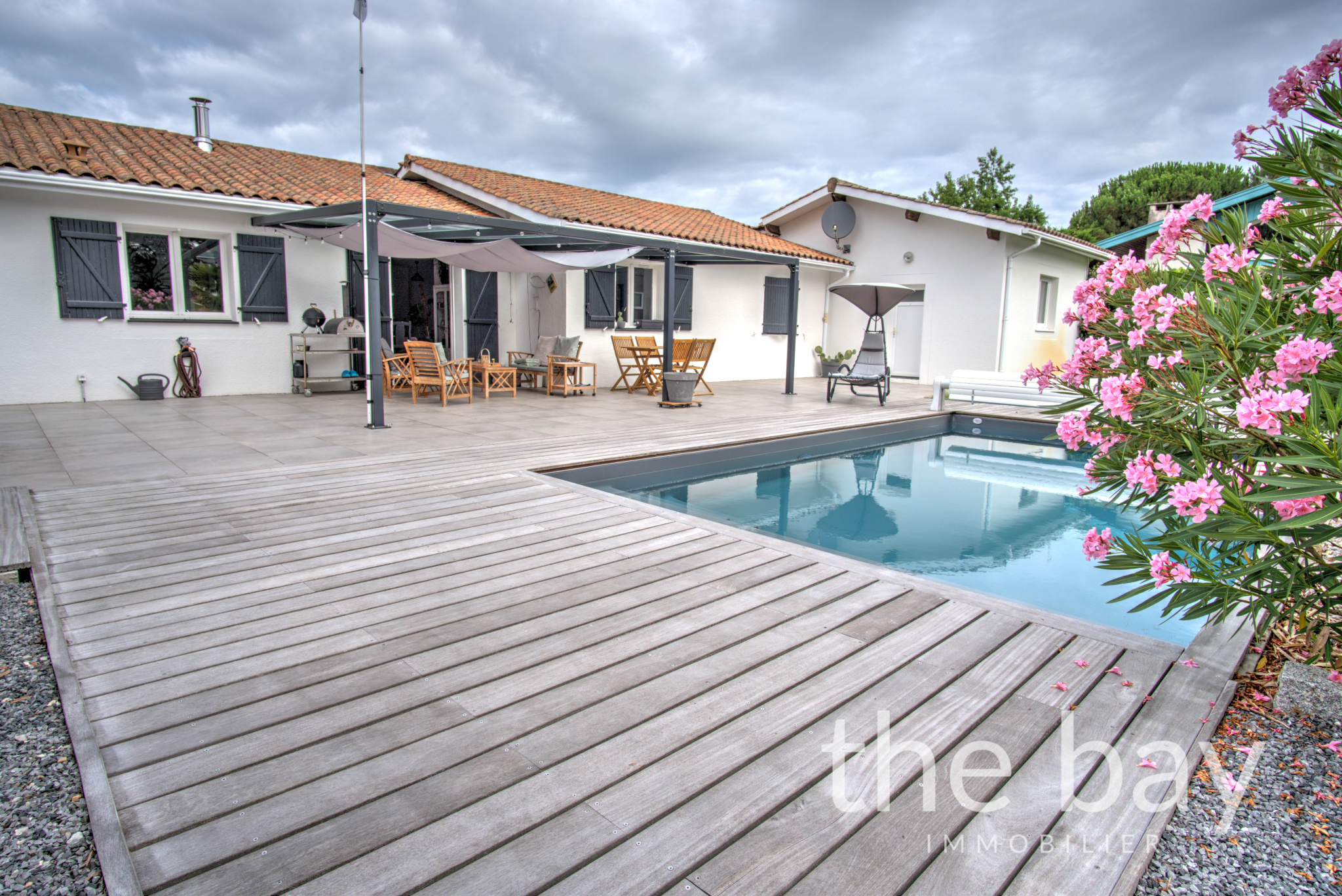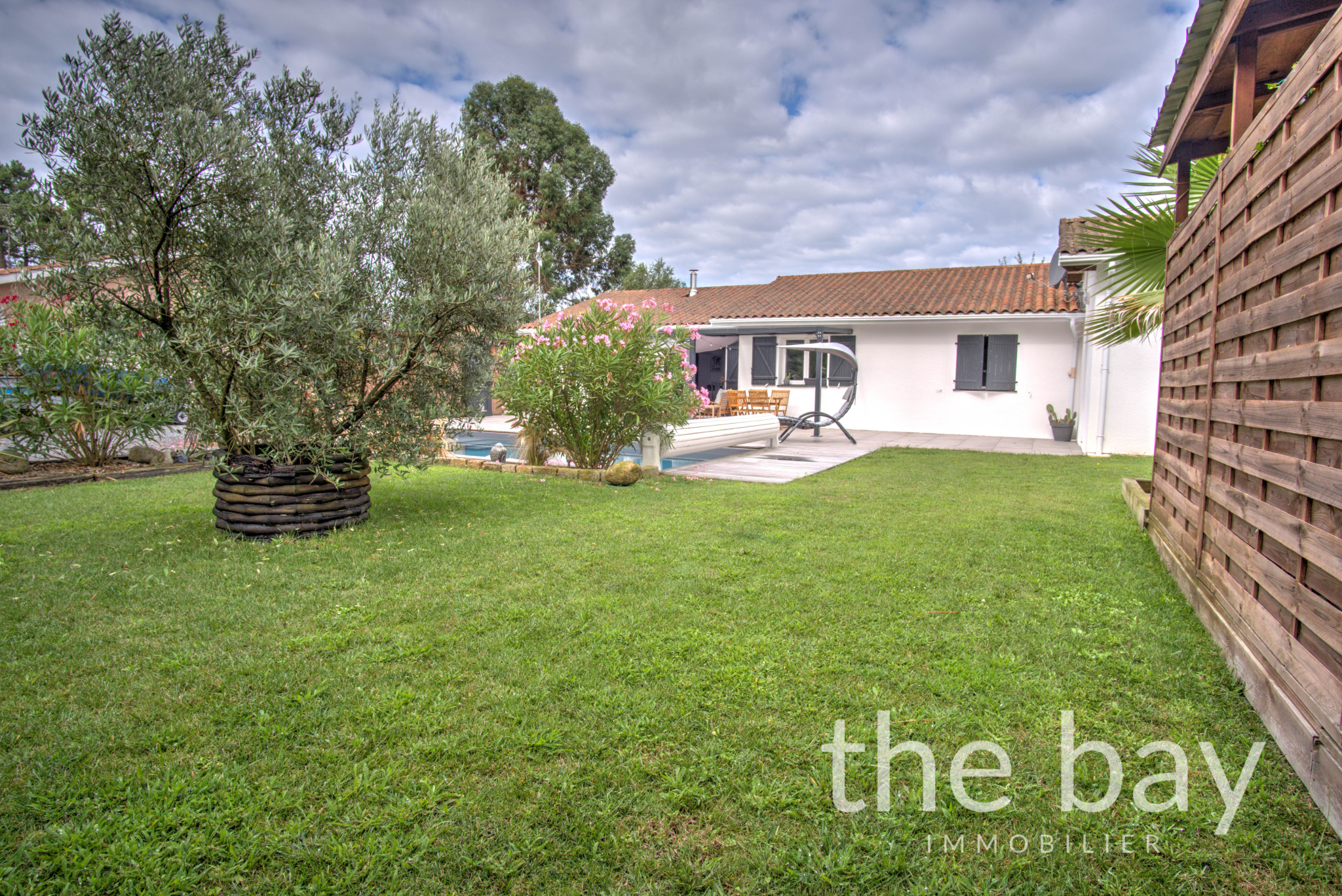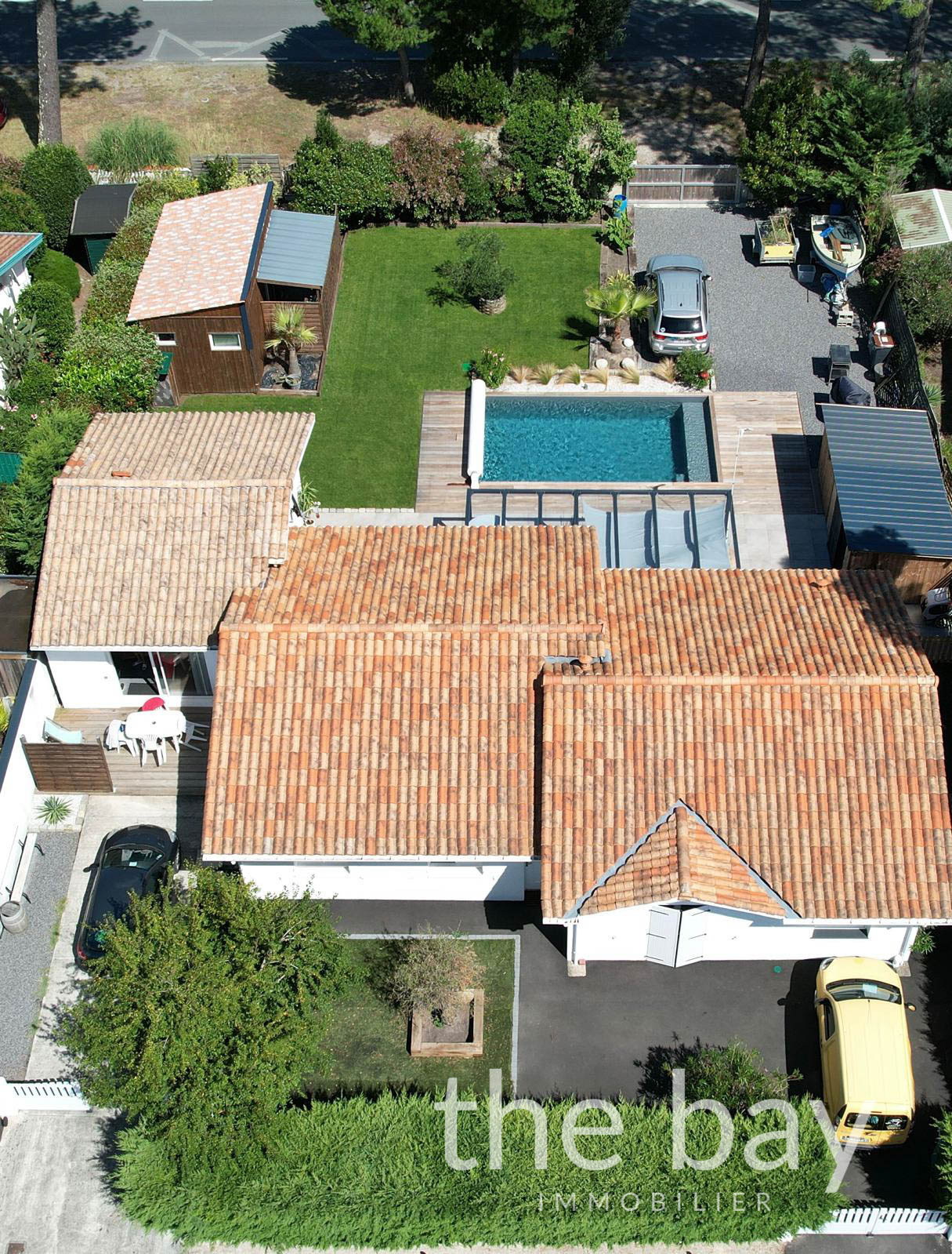 La maison principale de 123 m2 se compose d'un séjour traversant avec cuisine ouverte, donnant directement sur la terrasse et la piscine, de quatre chambres dont une suite parentale avec salle d'eau, d'une salle de bain, d'un WC et d'un cellier.