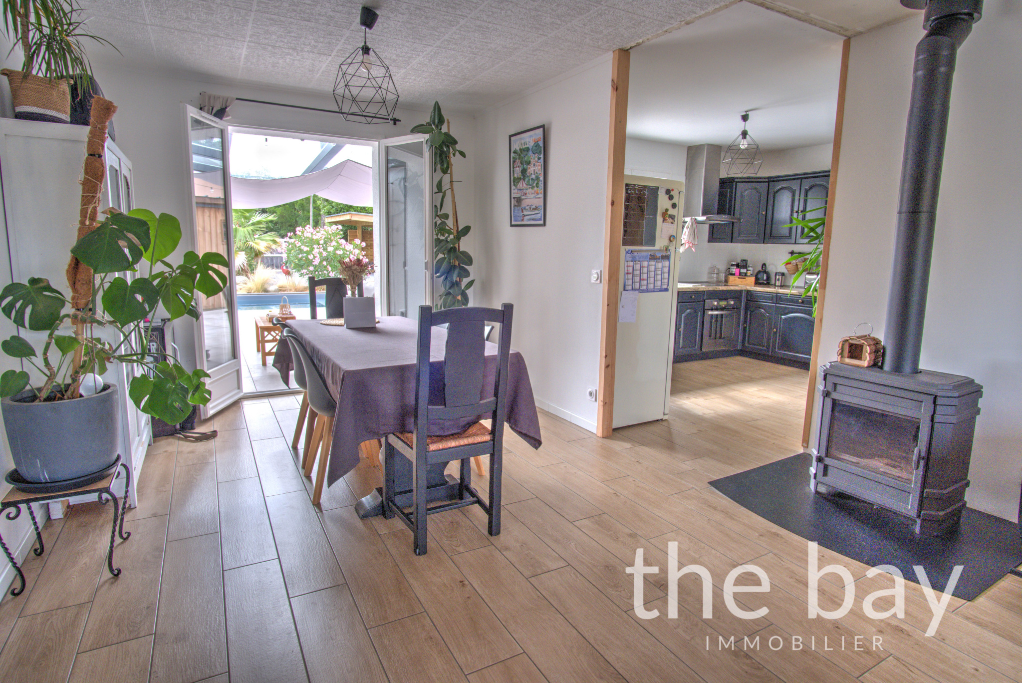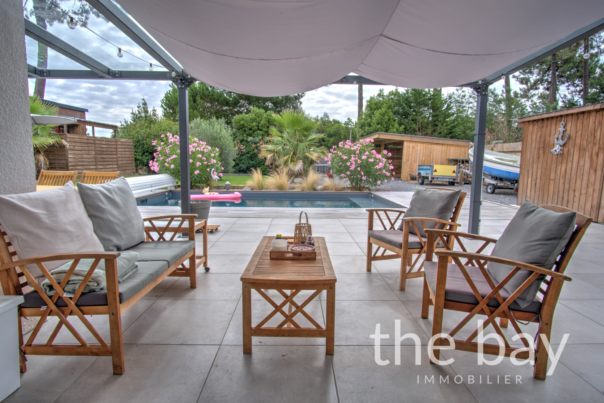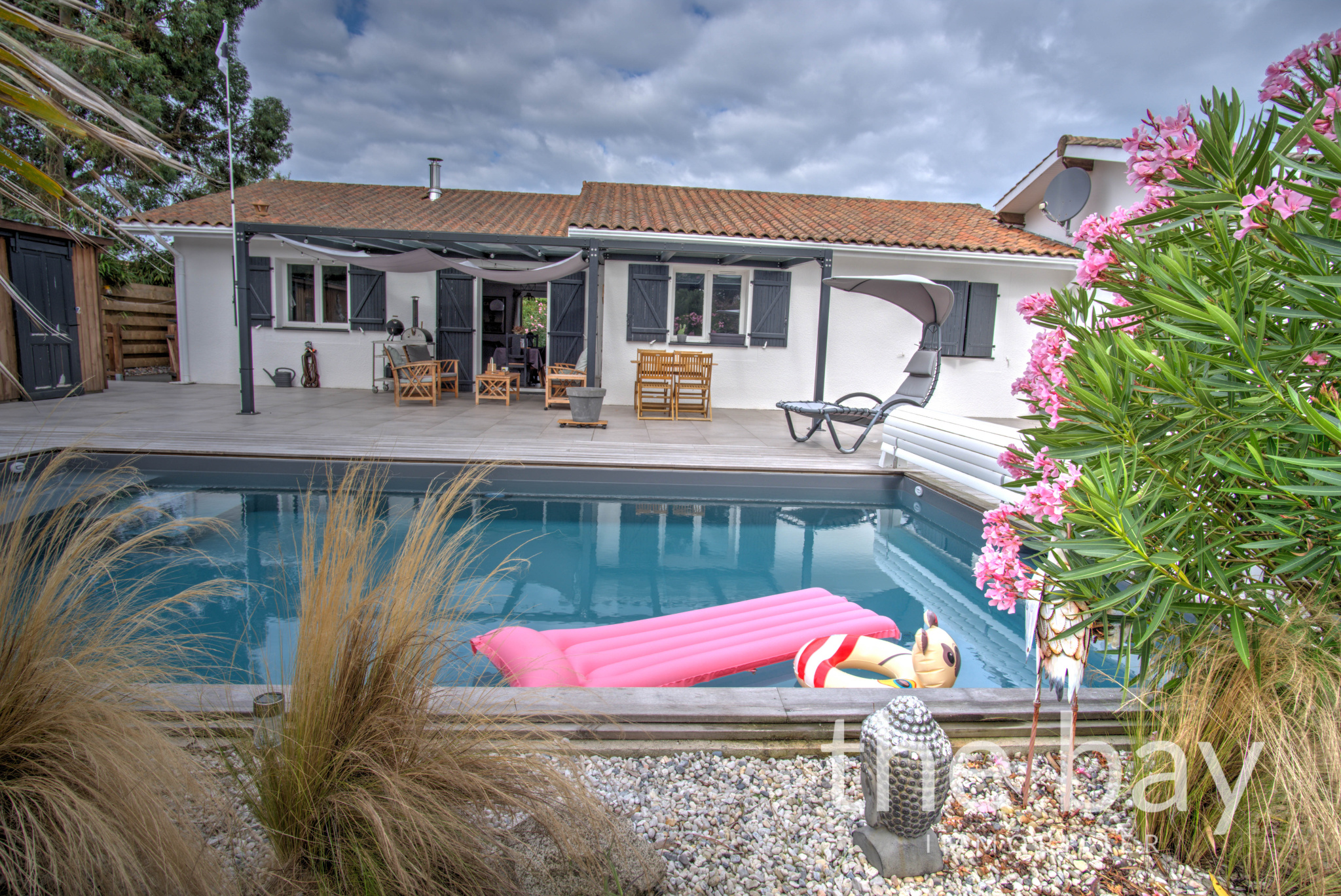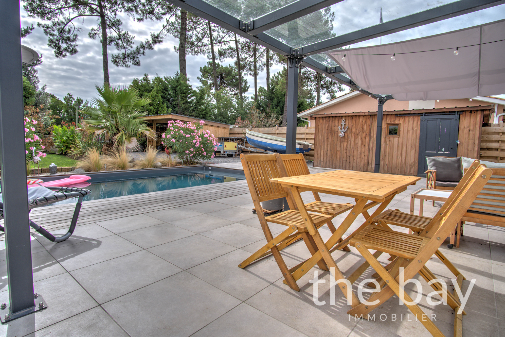 La maison principale de 123 m2 se compose d'un séjour traversant avec cuisine ouverte, donnant directement sur la terrasse et la piscine, de quatre chambres dont une suite parentale avec salle d'eau, d'une salle de bain, d'un WC et d'un cellier.