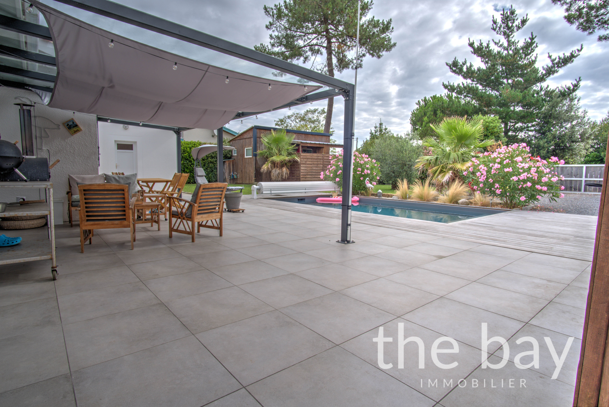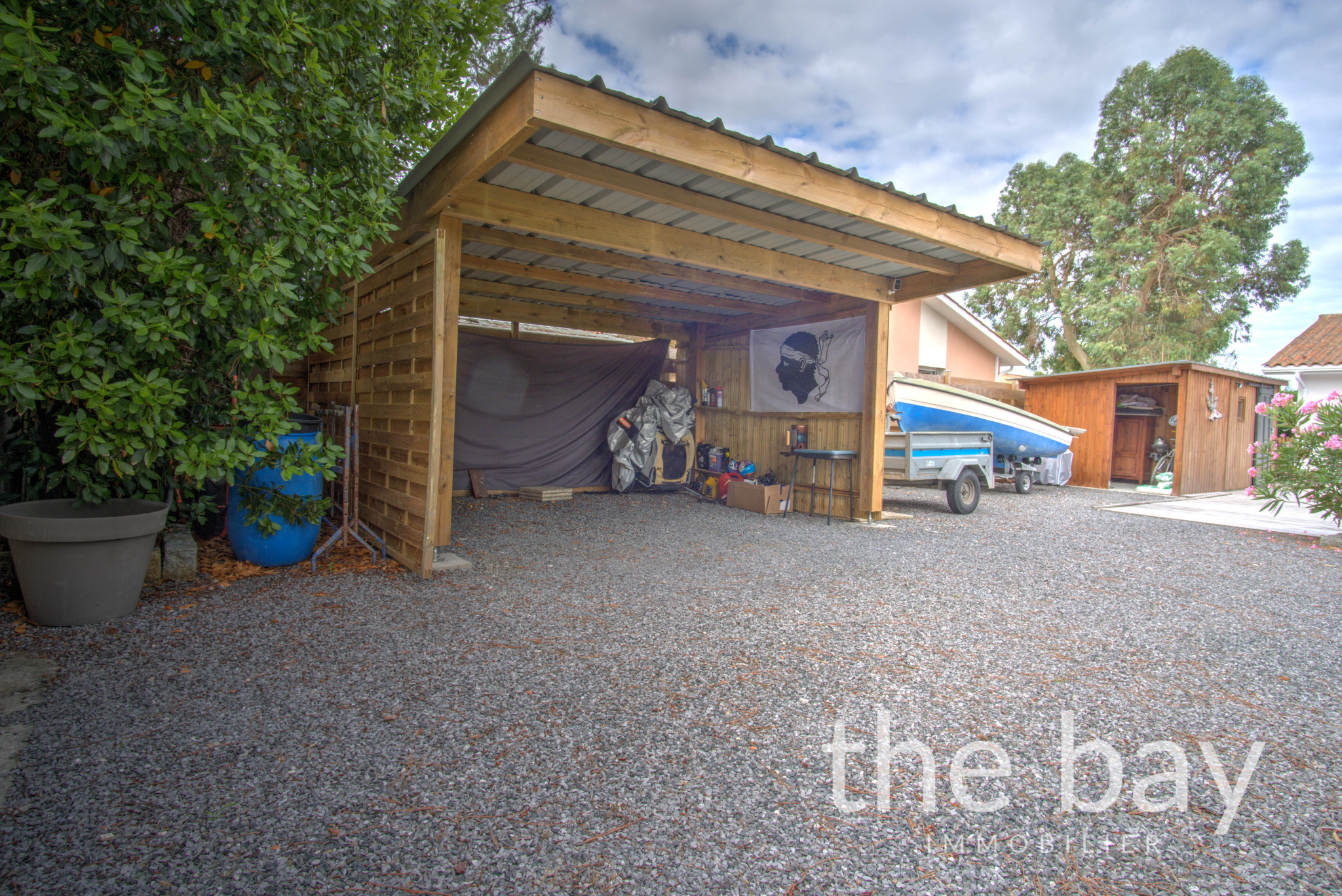 À l'extérieur, vous profiterez d'un magnifique jardin paysagé agrémenté d'une terrasse, d'une piscine, d'une pergola, d'un carport pour deux véhicules ainsi qu'un abri. Le terrain traversant bénéficie de deux accès indépendants.