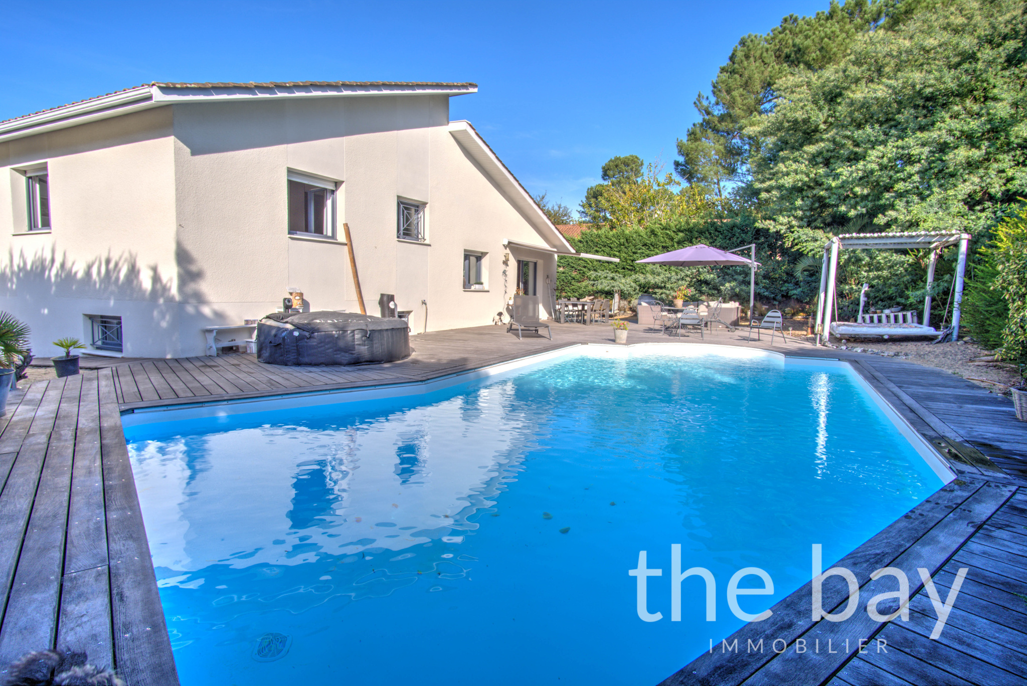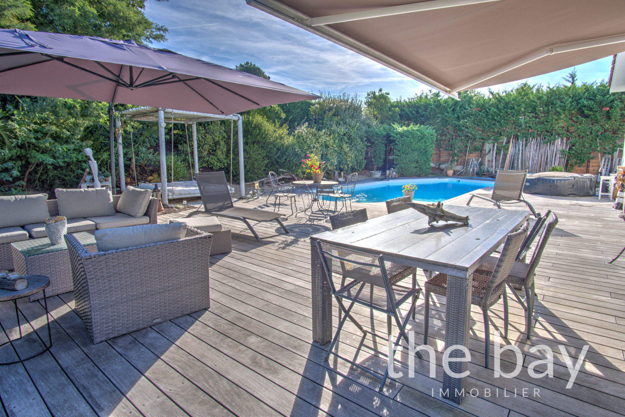 À l'extérieur, vous serez séduits par la grande terrasse en bois exotique, ouvrant sur une piscine à l'abri des regards. La propriété dispose également d'un boulodrome.