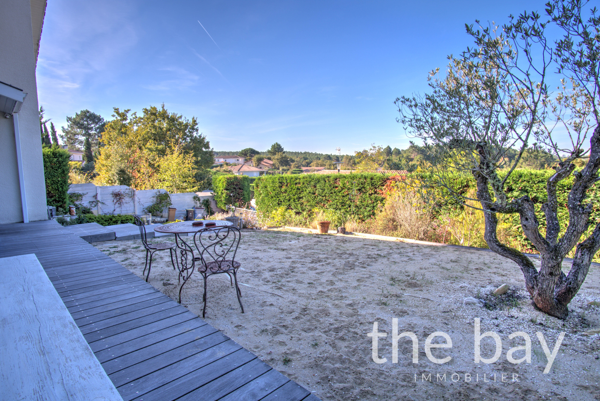 Le jardin, arboré et sans aucun vis-à-vis, offre une vue apaisante sur la forêt.