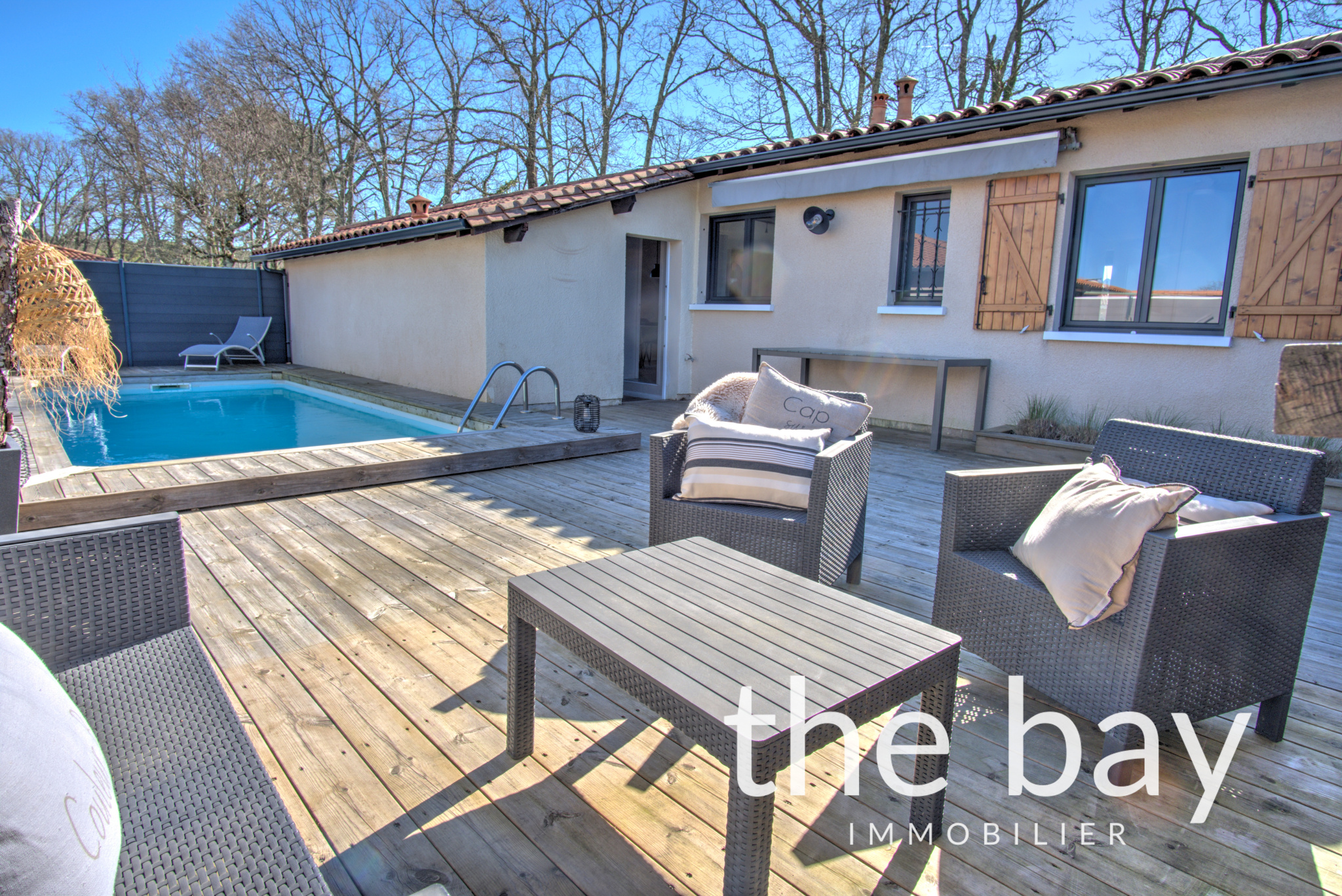 La maison dispose d'une terrasse couverte parfaite pour les repas en toute saison, ainsi que d'une seconde terrasse donnant sur une piscine au chlore de 3 x 6 m, propice aux moments de détente en famille ou entre amis.